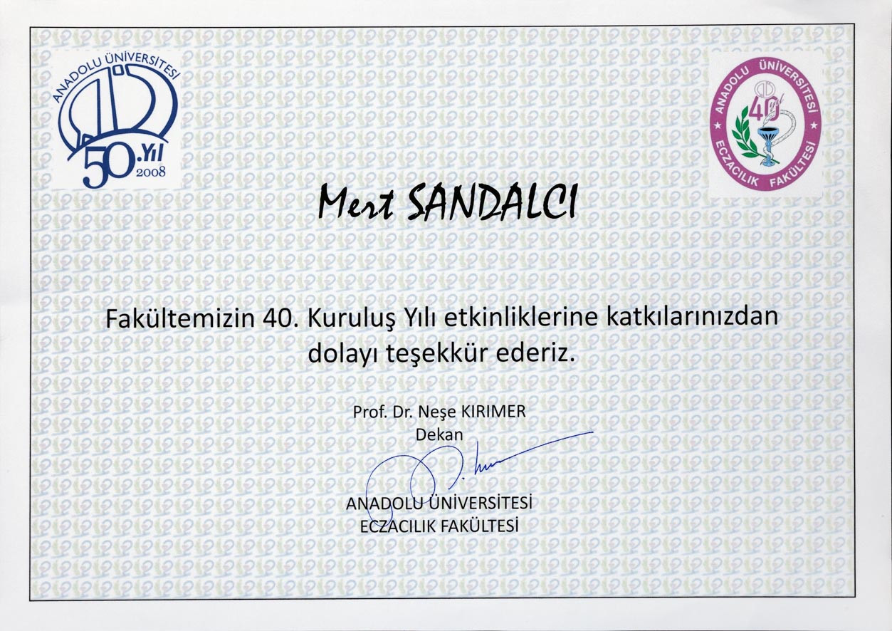 ANADOLU ÜNİVERSİTESİ ECZACILIK FAKÜLTESİ 40.YIL KUTLAMALARI KATILIM BELGESİ