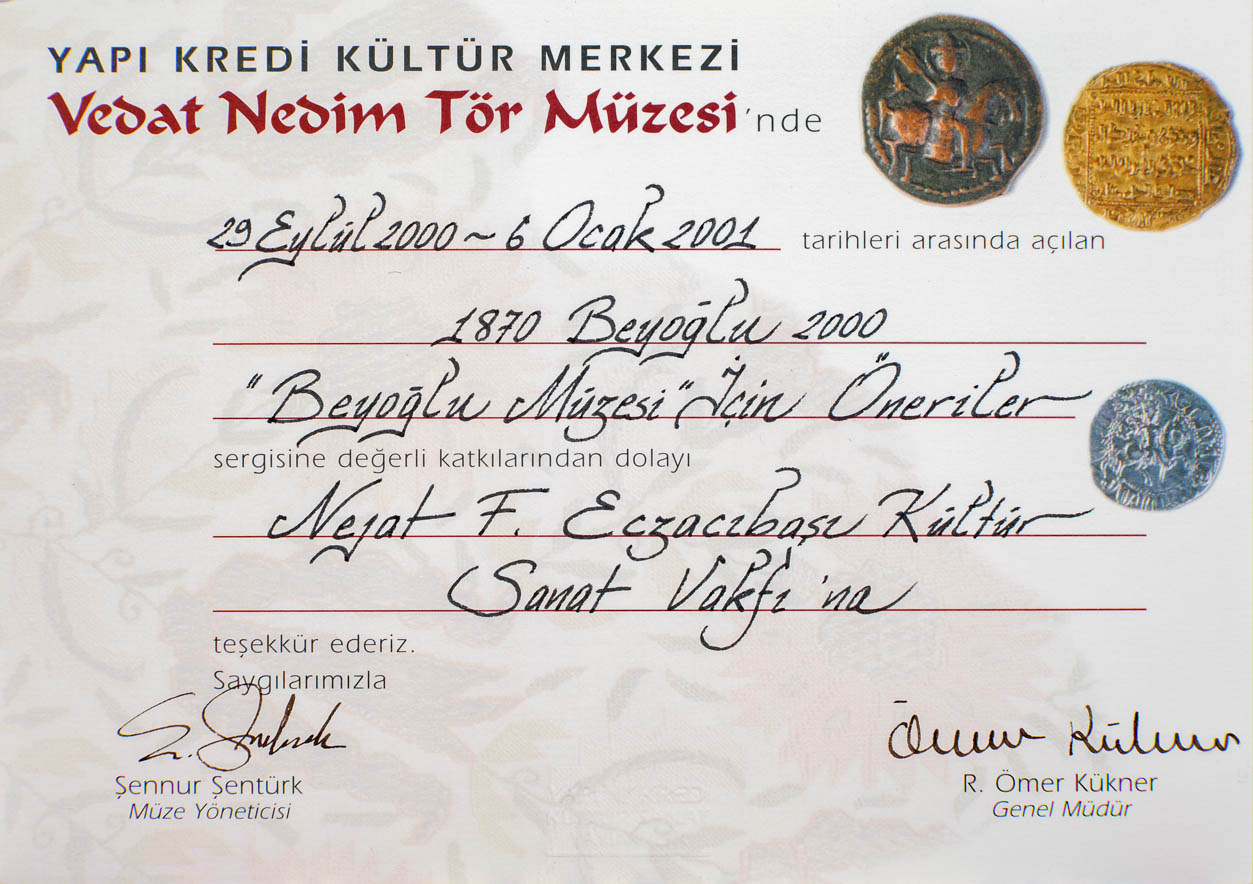 “BEYOĞLU MÜZESİ İÇİN ÖNERİLER” KONULU SERGİNİN HAZIRLANMASI İLE İLGİLİ ÇALIŞMALARIMDAN ÖTÜRÜ NEJAT F. ECZACIBAŞI’NA VERİLEN ANI BELGESİ