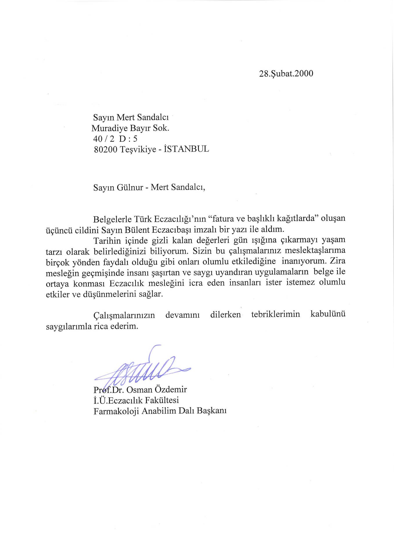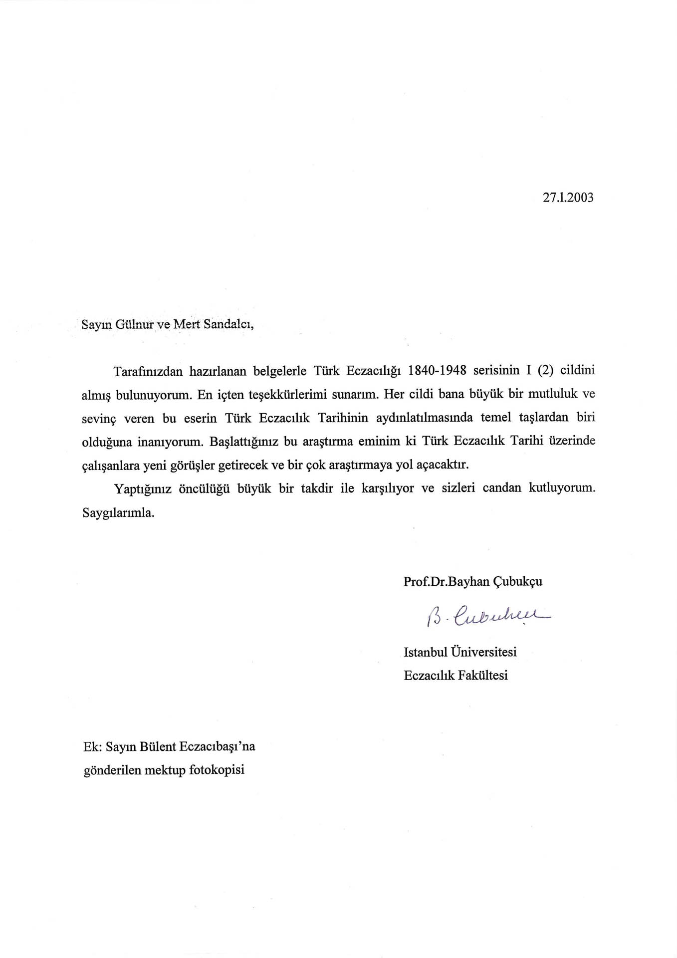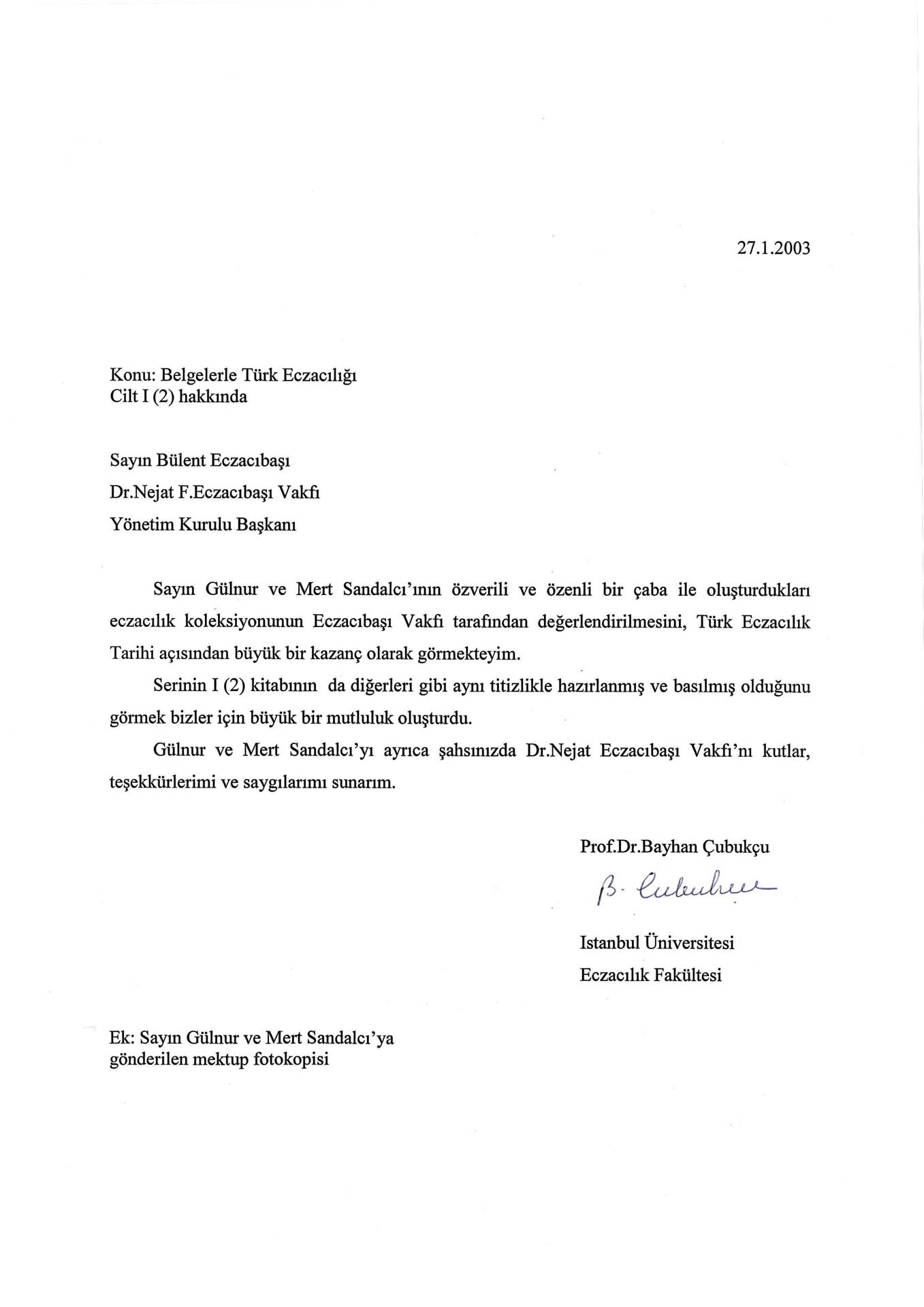 İSTANBUL ÜNİVERSİTESİ TEŞEKKÜR MEKTUBU - 2003
